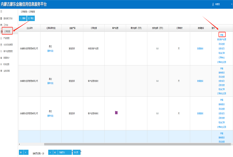 2.查看融资需求。点击“订单管理”,在操作栏点击“详情”,查看融资需求具体内容。