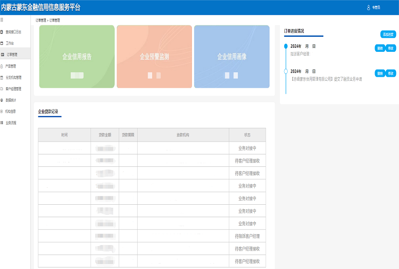 如订单进度情况以及企业贷款记录。若企业申请信用报告并出具完成后,还可查看企业信用报告、企业预警监测、企业信用画像。