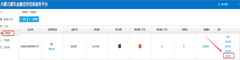 登录后,点击“订单管理”,查看订单进度,在操作栏点击“领取业务”。此外,还支持“业务移交”或“拒绝业务”,可根据实际情况自行选择。
