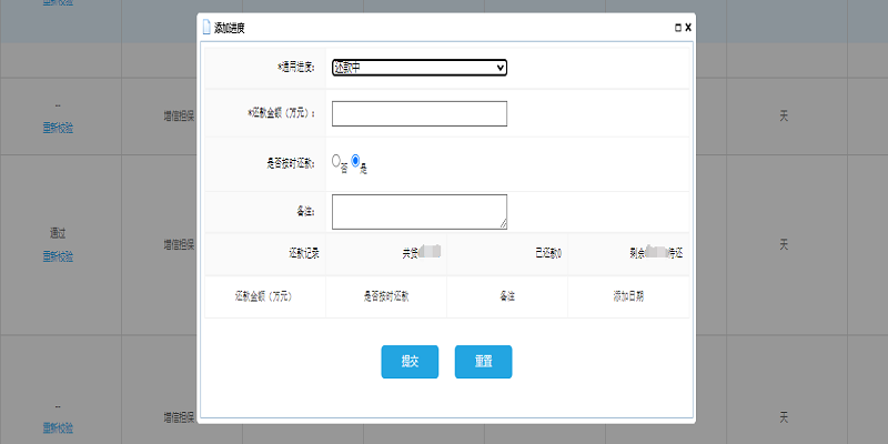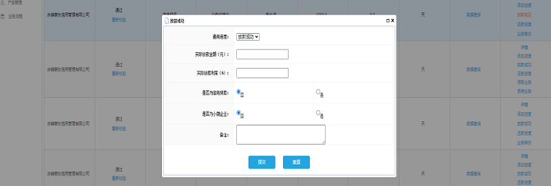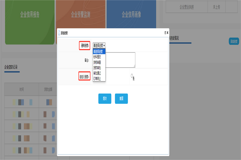 1.反馈还款数据。放款成功后,点击“订单管理”,在操作栏点击“还款进度”,可随时更新企业履约还款情况。如处于“还款中”,填写还款金额、是否按时还款、还款日期。