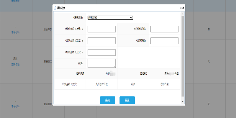 如处于“还款完成”,填写还款金额、逾期金额、坏账金额、总还款期数、逾期期数。