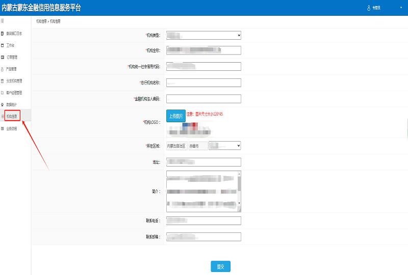 2.填写机构信息。点击“机构信息”,填写机构全称、统一社会信用代码、地址等信息。