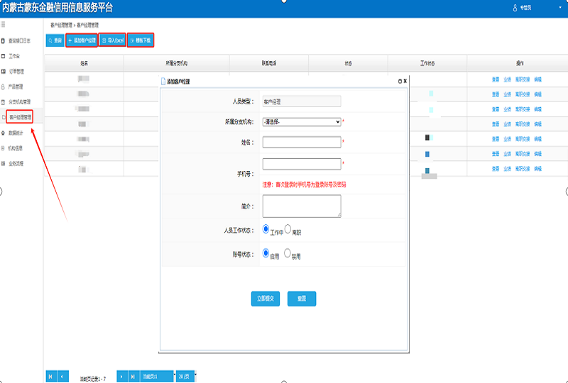 5.添加客户经理。点击“客户经理管理”,点击“添加客户经理”,填写客户经理信息。若数量较多,可下载模版进行集中导入。