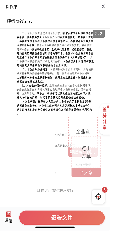 (四)点击“盖章”,选择印章及法人章,完成文件授权,点击“签署文件”。(第一次扫码在盖章前需要进行一次人脸识别操作)