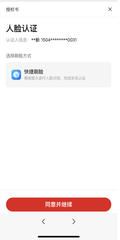 (五)签署文件后系统会跳转人脸识别页面,点击“快捷刷脸”完成后,点击“同意并继续”。