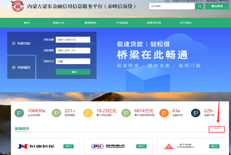 第五步:同时,企业也可以登录网站选择自己意向的金融产品进行“点对点”发布融资需求。进入官网后点击“信易贷专区”,点击“更多”。