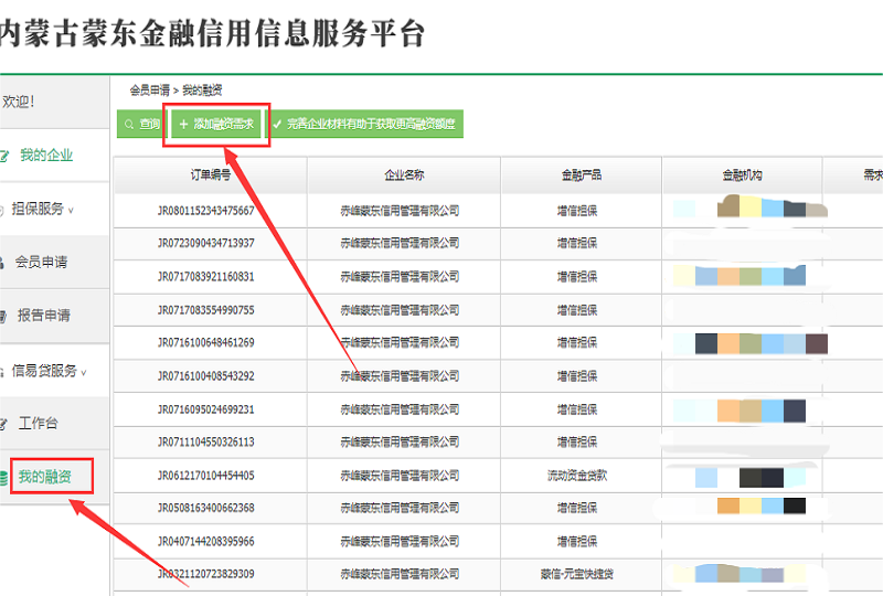 第三步:点击“我的融资”, 点击“添加融资需求”,点击“发布融资需求”。